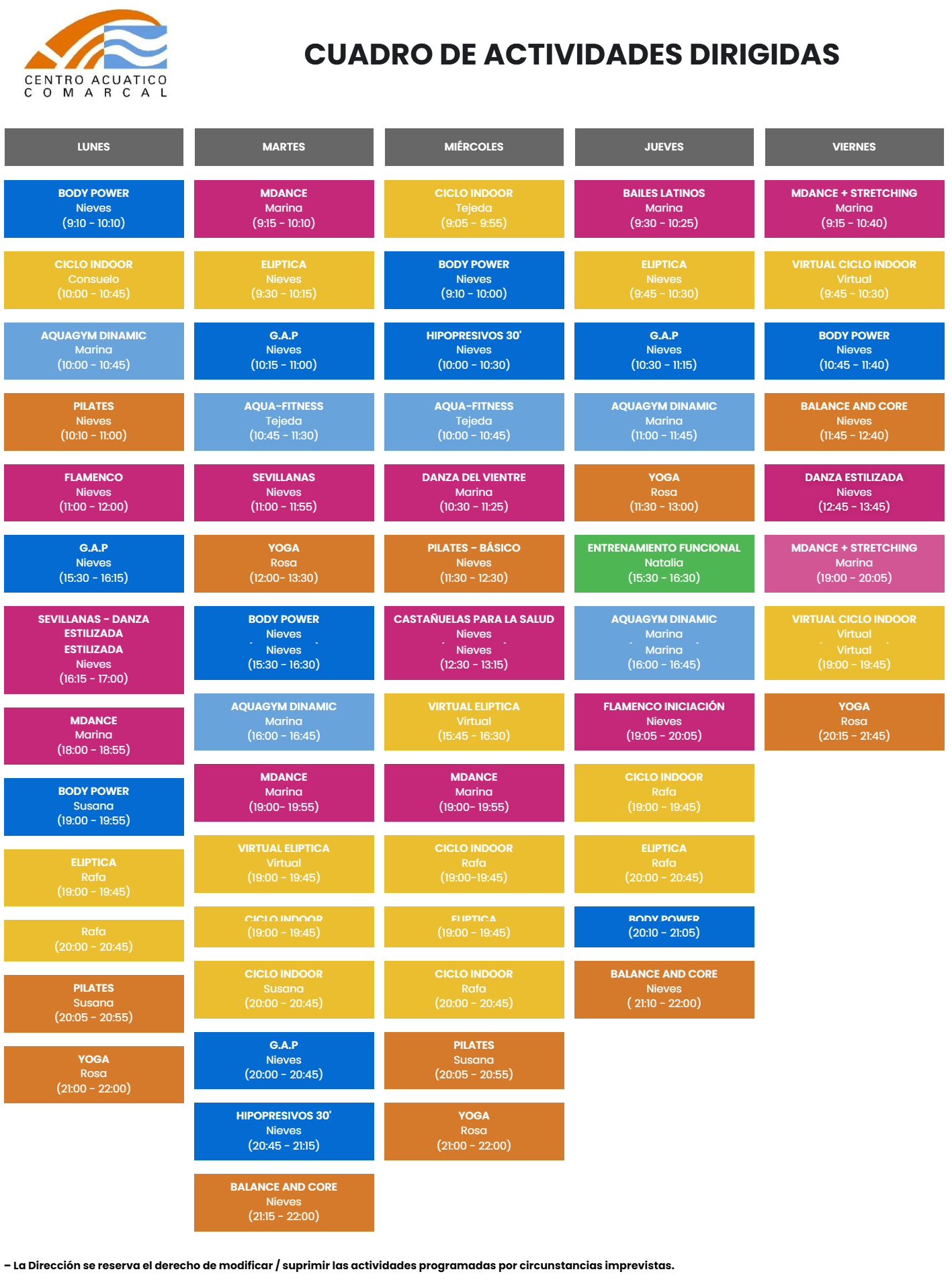 – Se informa que la programación de las actividades dirigidas publicada en la página web corresponde al periodo comprendido entre el 1 de septiembre 2025 y el 30 de junio 2026